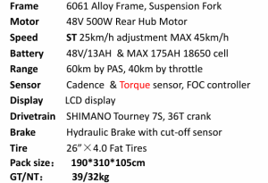 M2-L 26” MTB E-Bike 6061 Alloy Frame, Suspension Fork48V 500W Rear Hub Motor ST 25km/h adjustment MAX 45km/h