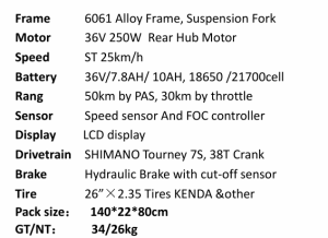 LC11 26”MTB E-Bike 6061 Alloy Frame, Suspension Fork36V 250W Rear Hub Motor SpeedST 25km/h